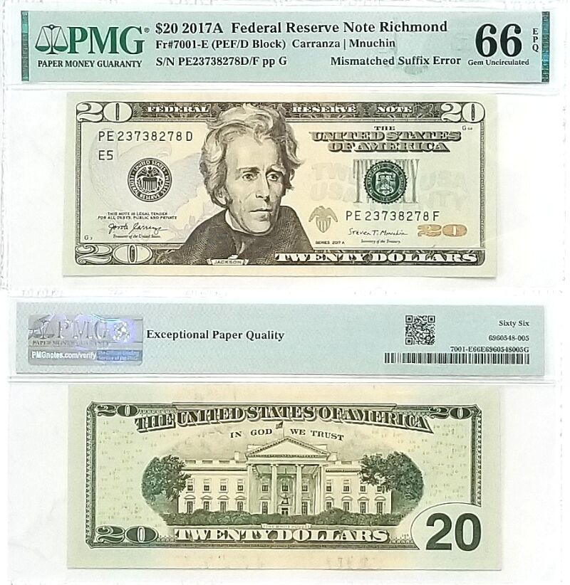 2017-A $20 Federal Reserve Note Mismatched Suffix PMG Gem CU-66 EPQ quantity