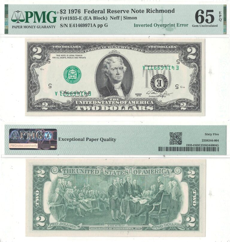 1976 $2 Federal Reserve Note Inverted Overprint Error PMG Gem CU-65 EPQ quantity