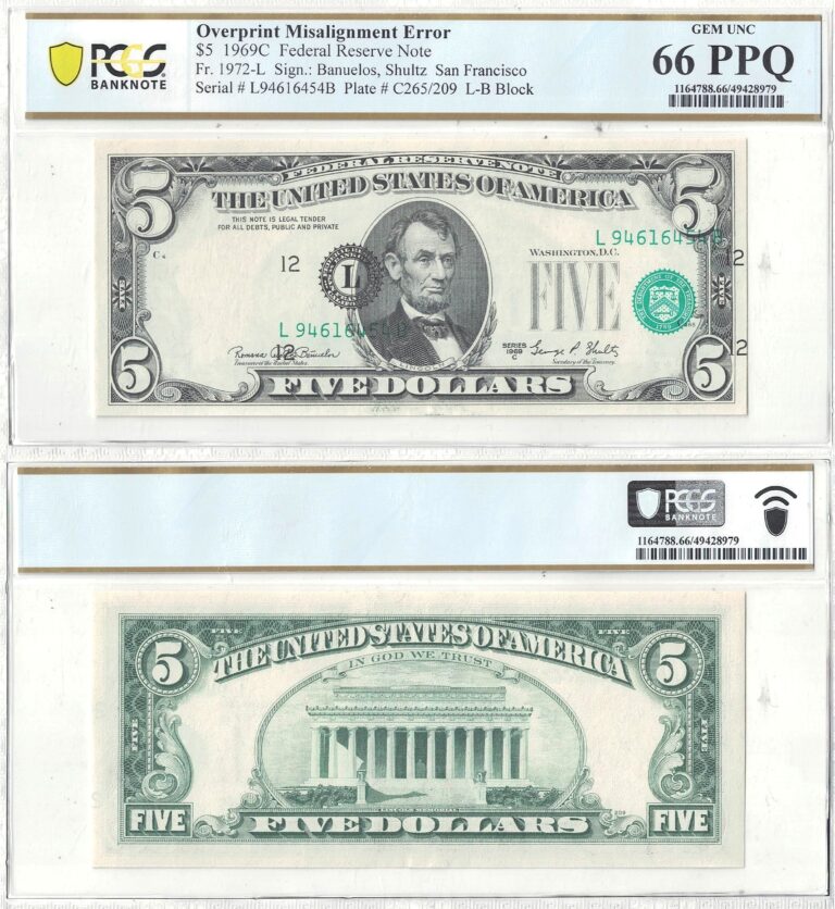 1969-C $5 Federal Reserve Note Overprint Misalignment Error PCGS Gem CU-66 PPQ quantity
