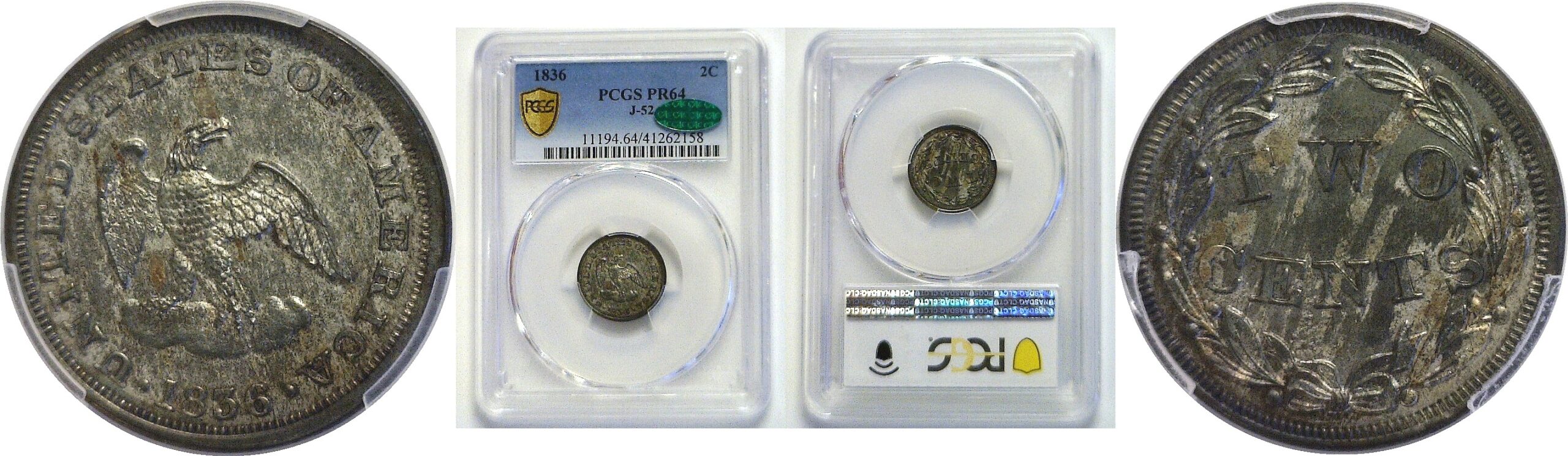 CAC. R-6. A scarce and desirable pattern as it was designed nearly three decades before the Two Cent denomination was finally issued by the Mint. The obverse features a small eagle on a cloud, reminiscent of the Draped Bust silver dollar reverse design. The reverse has TWO CENTS in the center surrounded by a laurel wreath. Struck in billon (90% copper, 10% silver) with a plain edge. This is a very attractive example with a sharp strike and beautiful original surfaces.