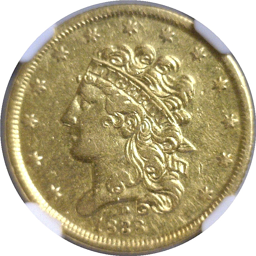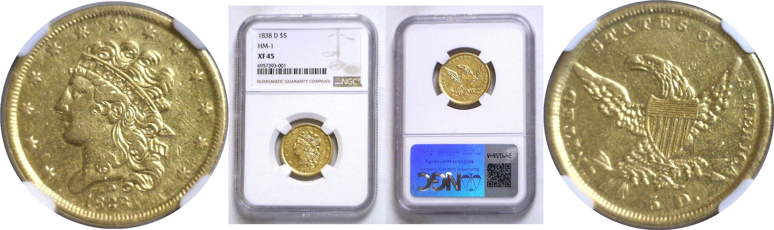 HM-1. Bright yellow-gold surfaces that are well struck and display plenty of luster for the grade. Marks are minor and none of significance. This date is very popular as it is the first Dahlonega $5 issued and the only Classic Head from this mint.