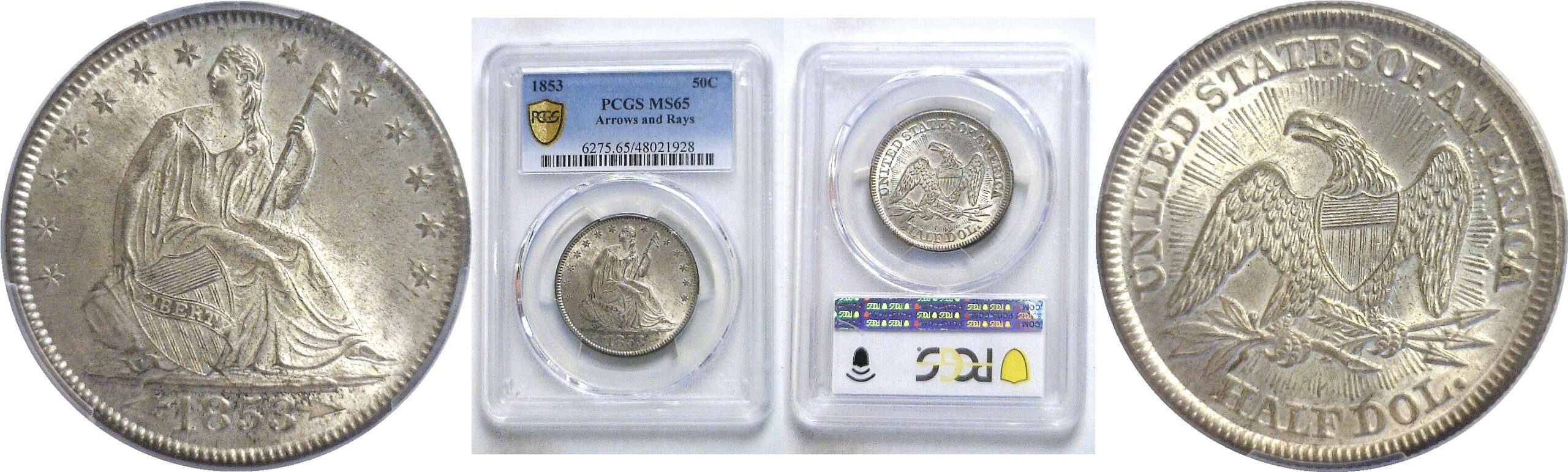 Arrows and Rays. Intense silver-gray luster flows over very sharply struck surfaces and displays excellent eye appeal. Marks are trivial and few. Arrows and rays were added to the existing design in 1853 to denote a reduction in silver content. The following year, the rays were eliminated but the arrows remained. The result was this popular one-year type.