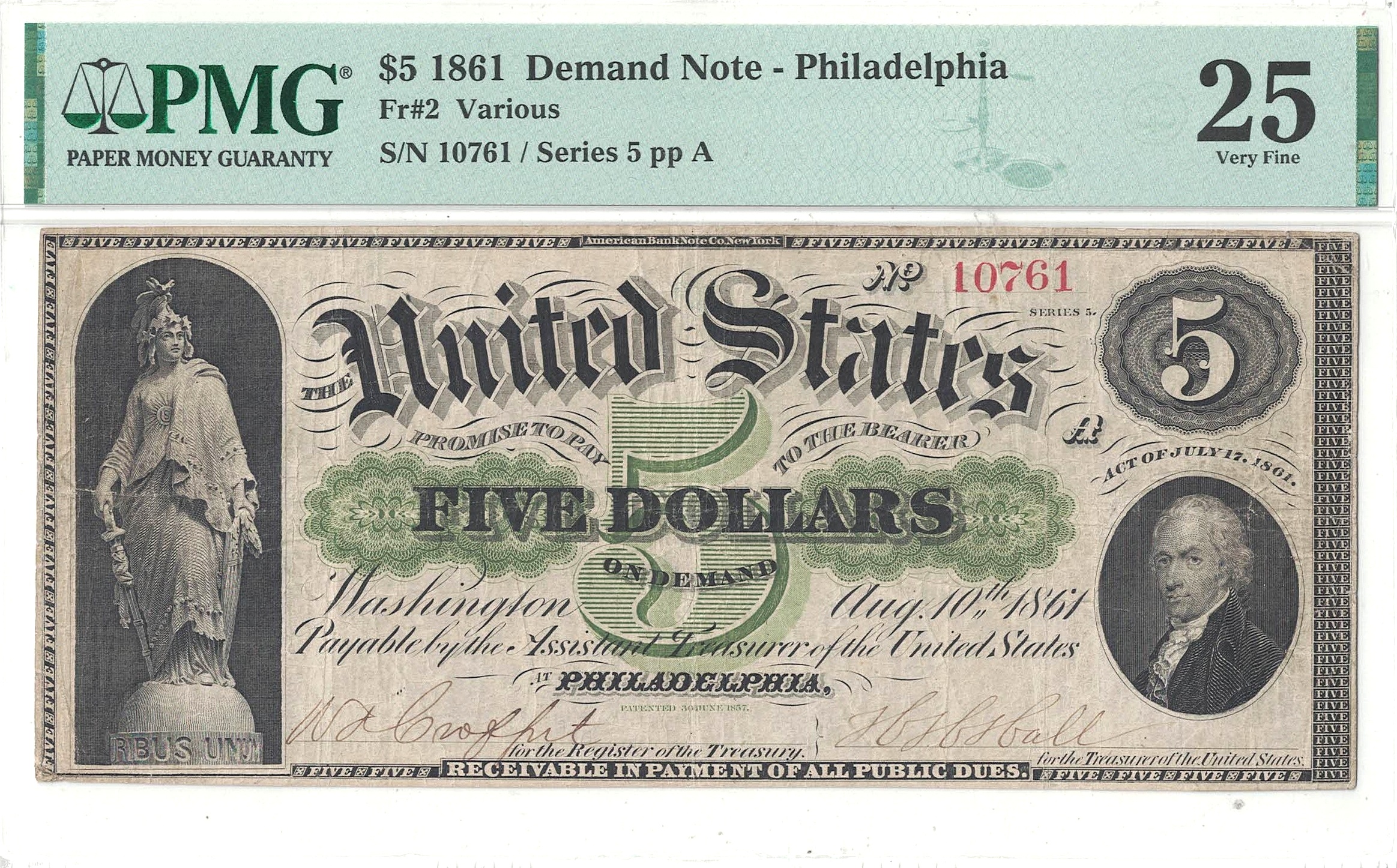 A solid and good looking Demand note with excellent color. The signatures are strong and the margins are full. Often found with multiple problems, this note really stands out for being problem-free.
