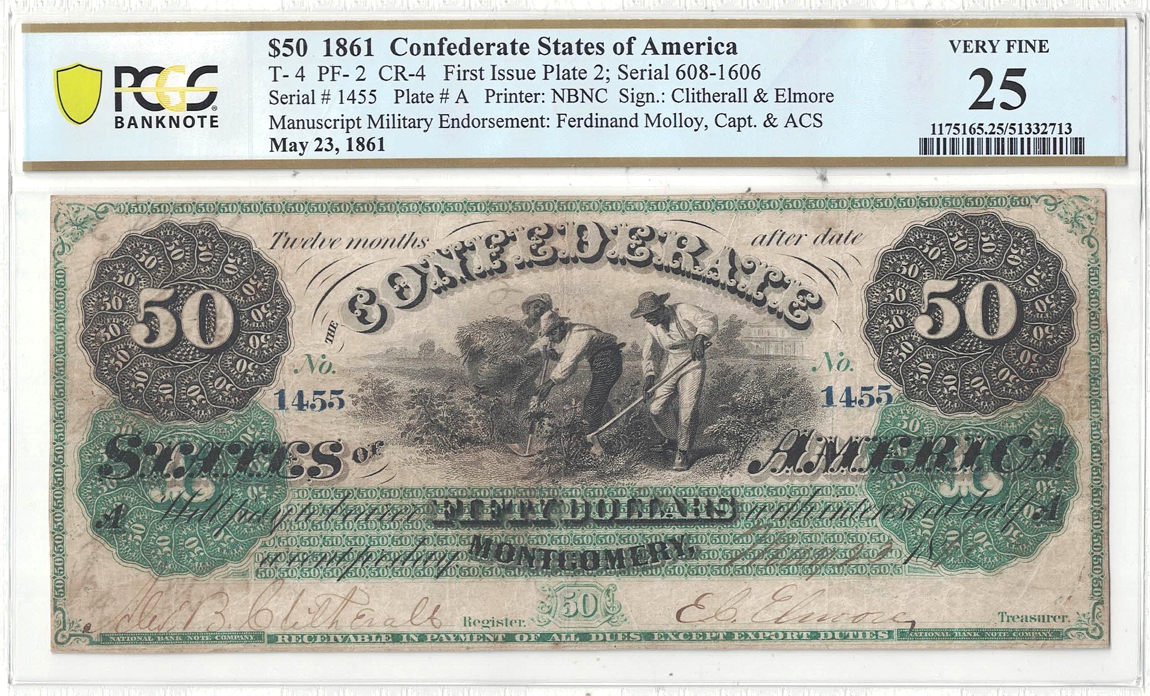 1861 $50 Confederate Note T-4 PCGS VF-25 Military Endorsement