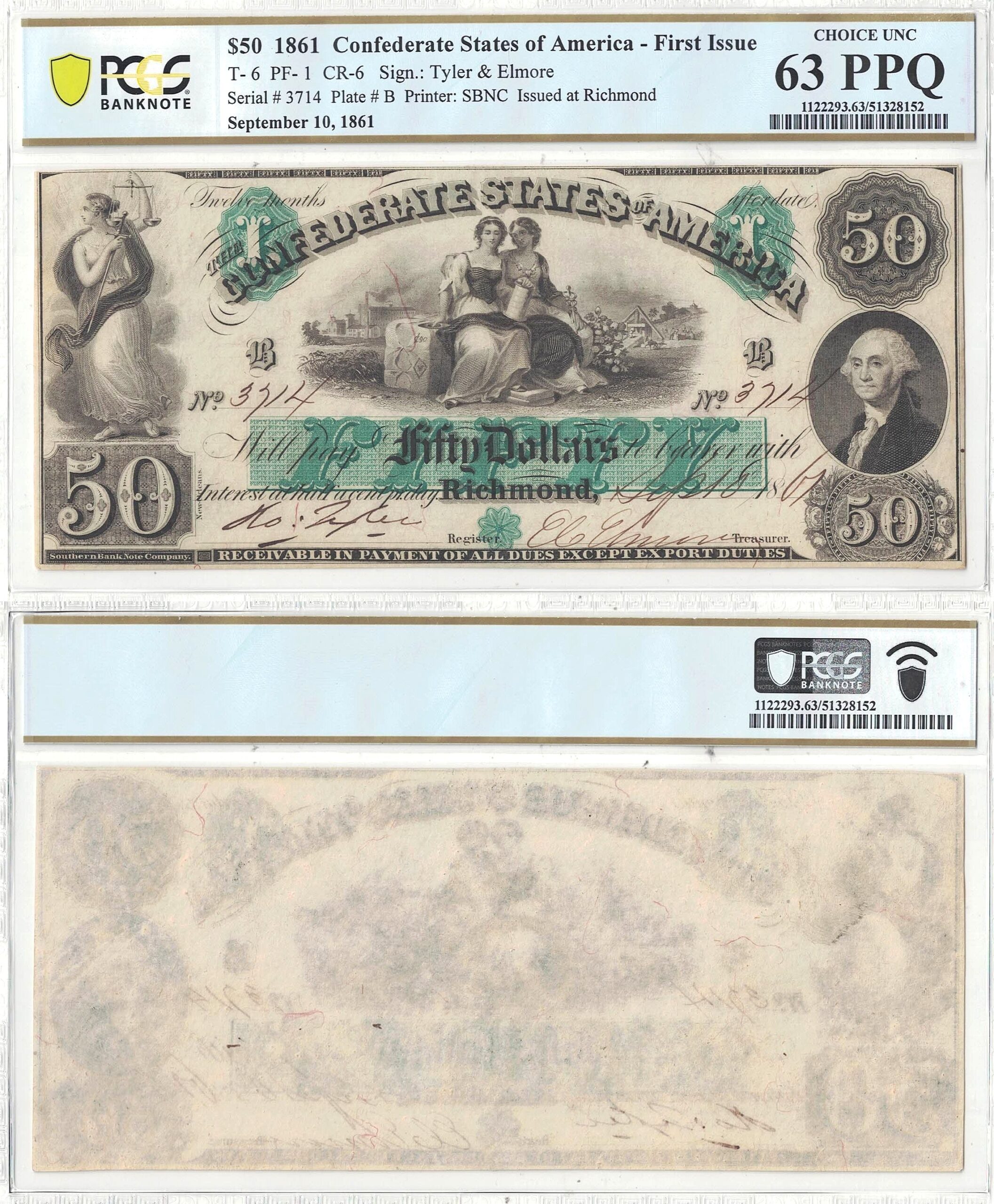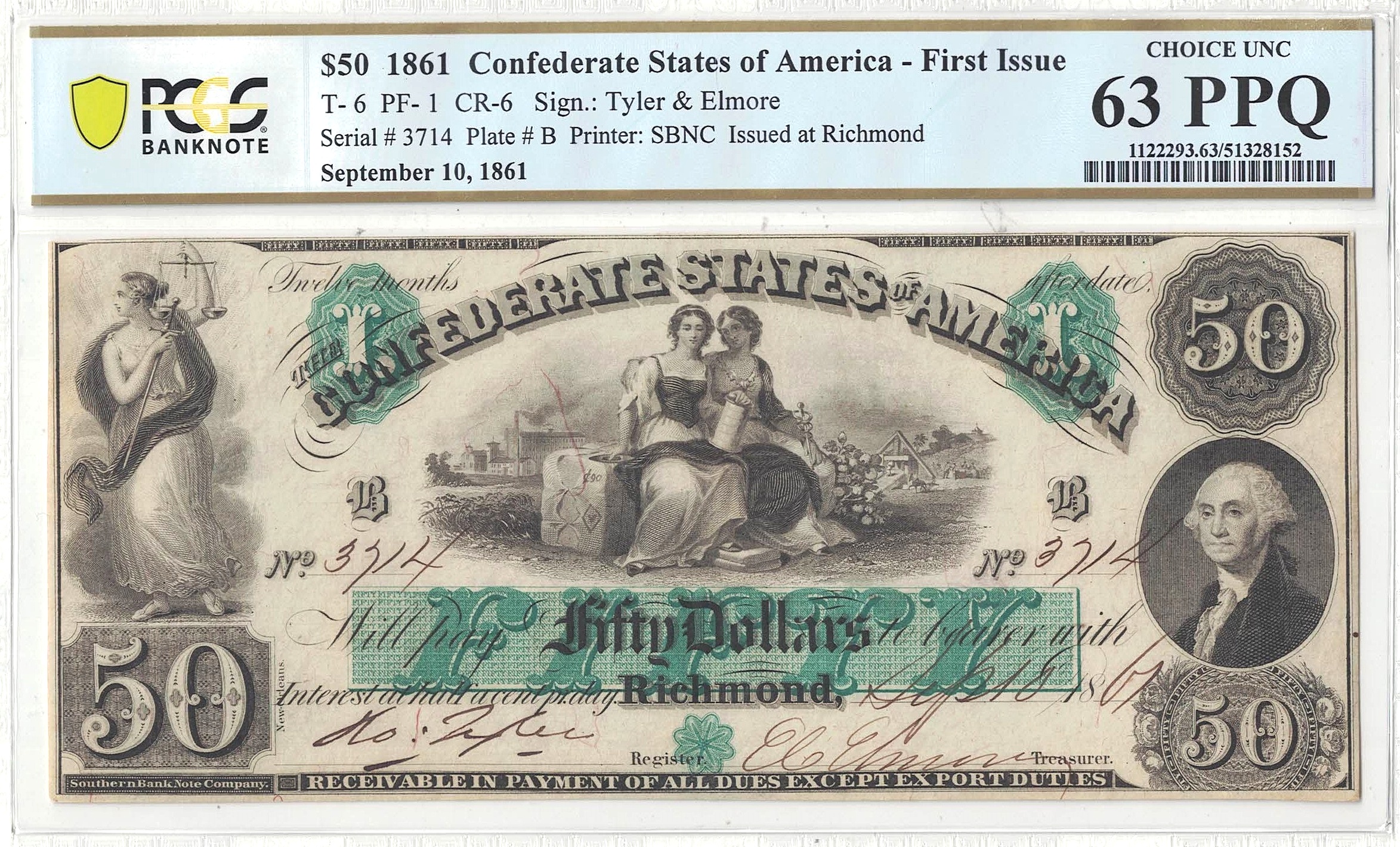 An attractive early Richmond $50 with great color and premium paper. Three vignettes include a central vignette of Pallas (agriculture) and Ceres (industry), one of George Washington at right, and Justice at left. Signatures are still bold. Borders are nearly fully framed with the upper left corner just shy of the mark. Wonderful eye appeal!