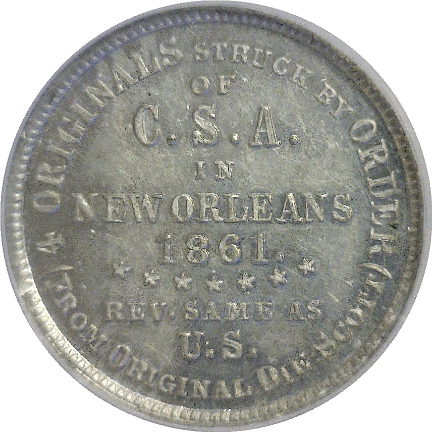 CSA Scott Restrike Half Dollar. In 1879 J.W. Scott purchased the original C.S.A. half dollar die from Ebenezer Locke Mason, Jr., who had originally acquired it from Dr. B. F. Taylor, former chief coiner of the New Orleans Mint. Scott overstruck 500 1861-dated halves with the die after planing off the reverses, then paired the C.S.A. die with a “token” die to strike another 500 pieces in white metal. This high-grade example of the latter issue is well struck with crisp luster and proof-like surfaces. Listed in the Redbook under Confederate Half Dollars.