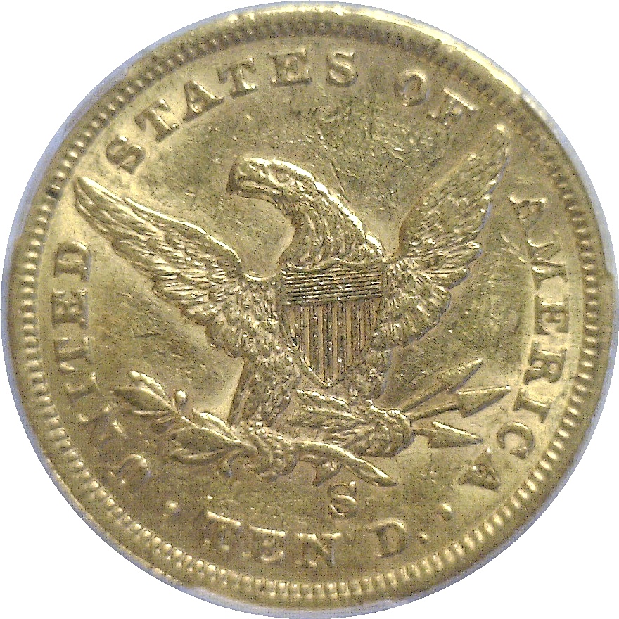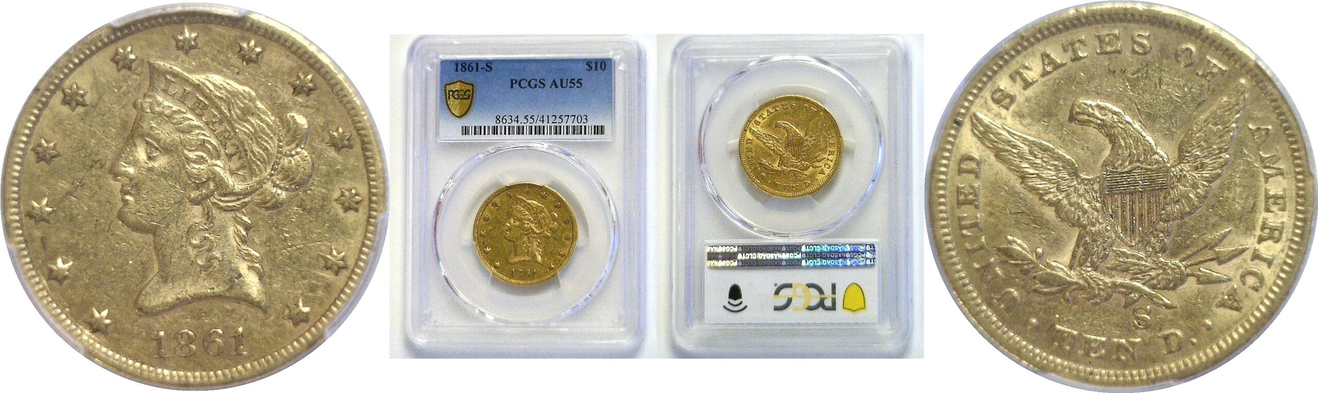 Just 15,500 minted with a low survival rate. A string of rare dates came out of the San Francisco Mint in the 1850’s thru the late 1870’s. All these dates had relatively low mintages plus they saw heavy commercial use, so high grade coins are very rare. PCGS has yet to grade an 1861-S in mint state! This is an attractive Choice AU with strong detail and lustrous surfaces that have fewer marks than typically seen on these early ‘S’ mint ‘Tens’.