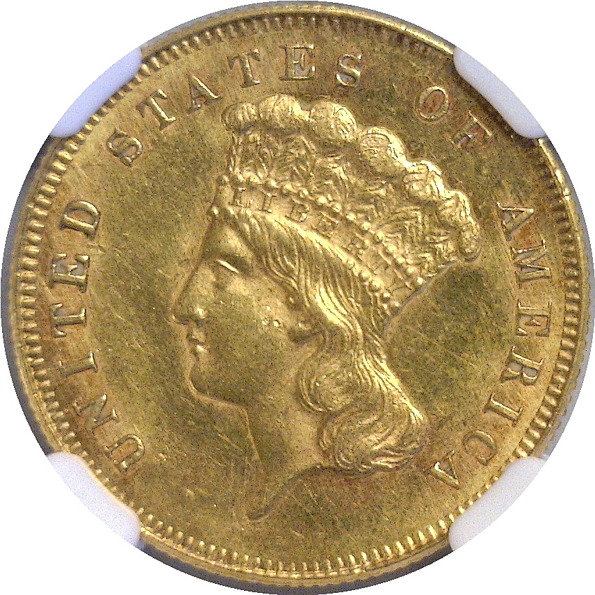 A scarce Civil War era issue with a mintage of just 2,630. This is a pleasing example with a sharp strike, minimal abrasions for the grade, and lustrous gold surfaces.