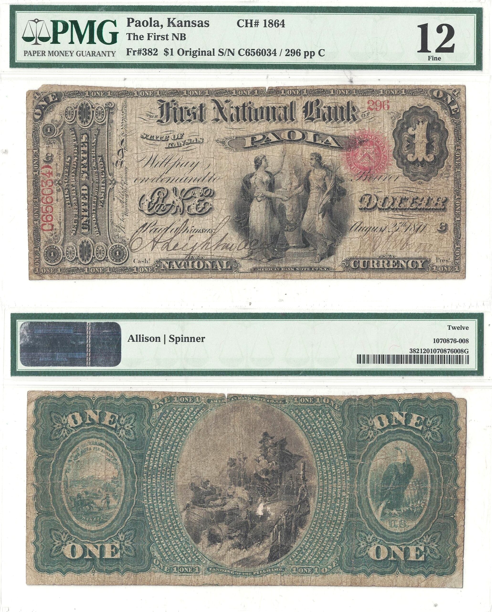 First National Bank of Paola. Fr 382. Charter #1864. Original Series. A rare Miami County bank that only issued First Charter examples. Just 4 notes are known according to Track & Price. This example displays good color and even wear.