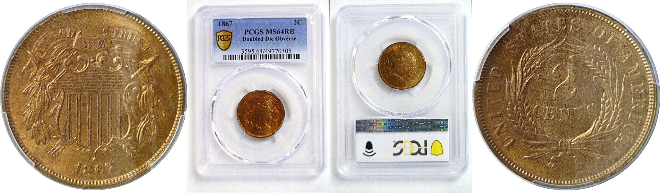 1867 Doubled Die Obverse. Two Cent Piece – PCGS MS-64 RB