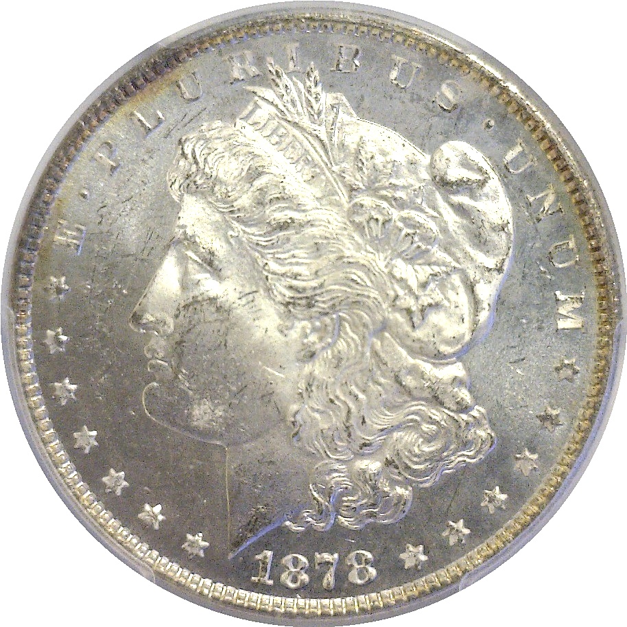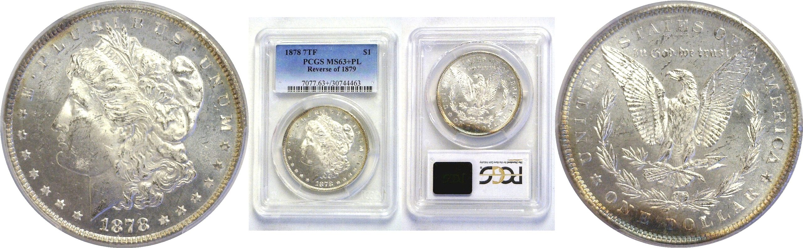 Reverse of 1879. Sharply struck with mirrored fields and frosty devices. A burst of blue-gold toning stays close to the reverse periphery at the bottom.