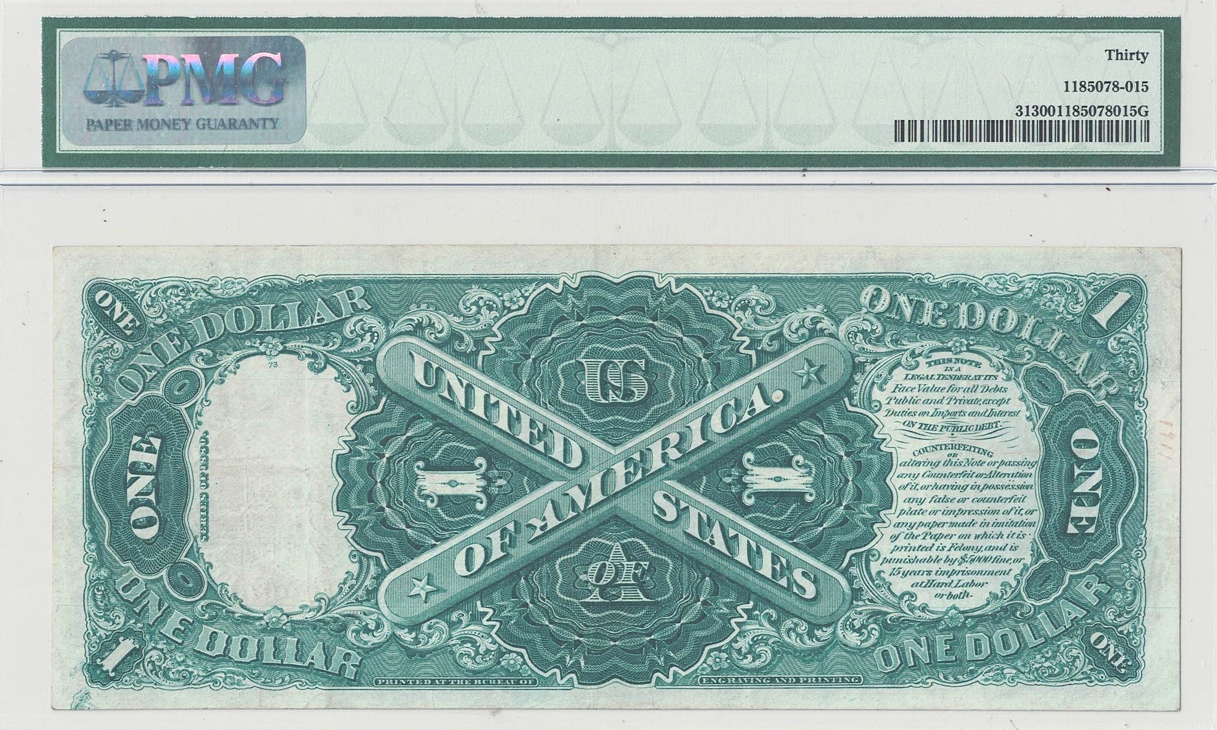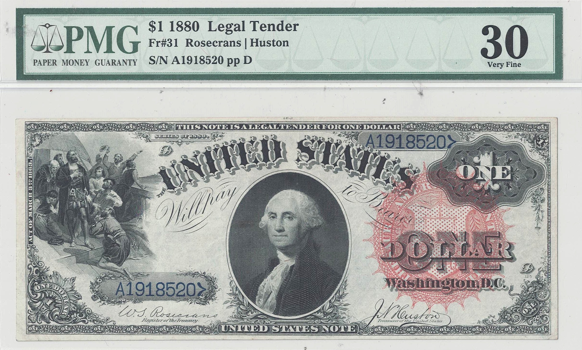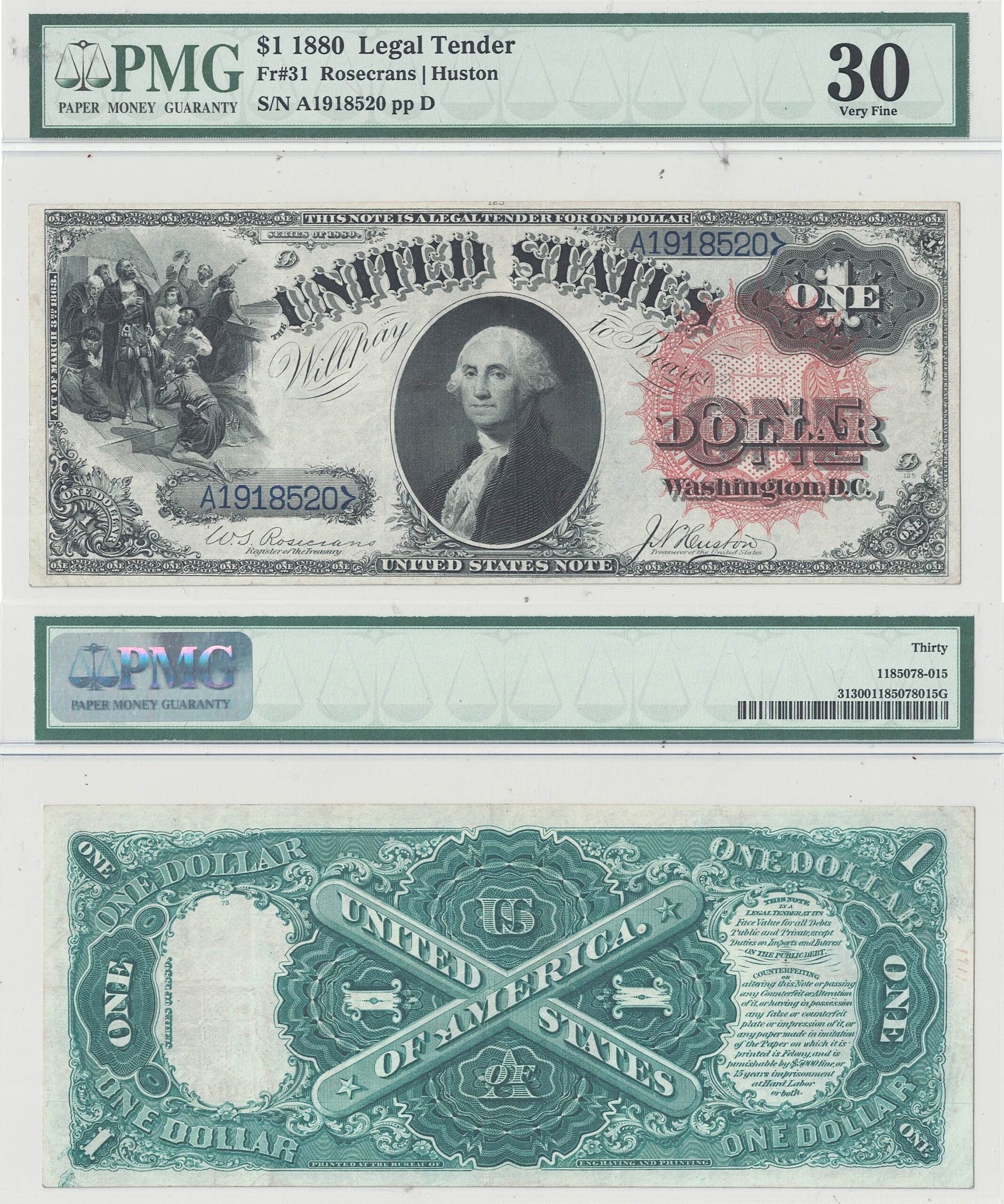 An attractive red seal, Series of 1880 ‘Washington’ with well balanced margins, strong inks and bright paper. Folding is light and a partial plate number can be seen at the top on the front.