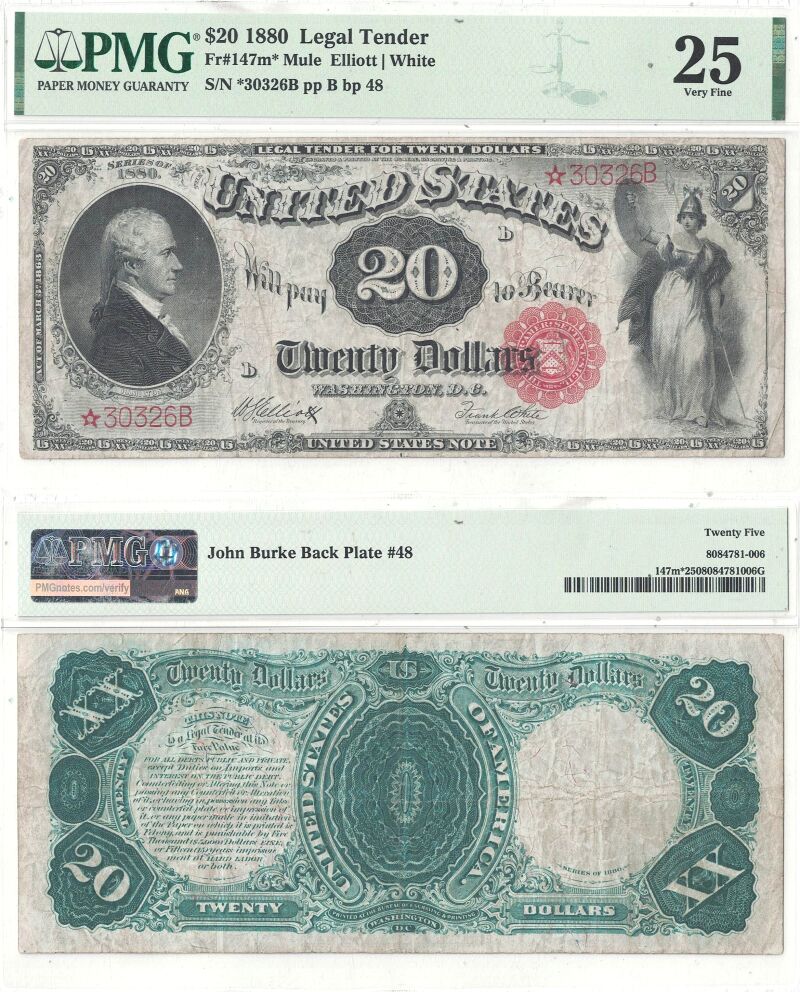 1880 $20 Legal Tender Note Star Note Fr-147m* PMG VF-25