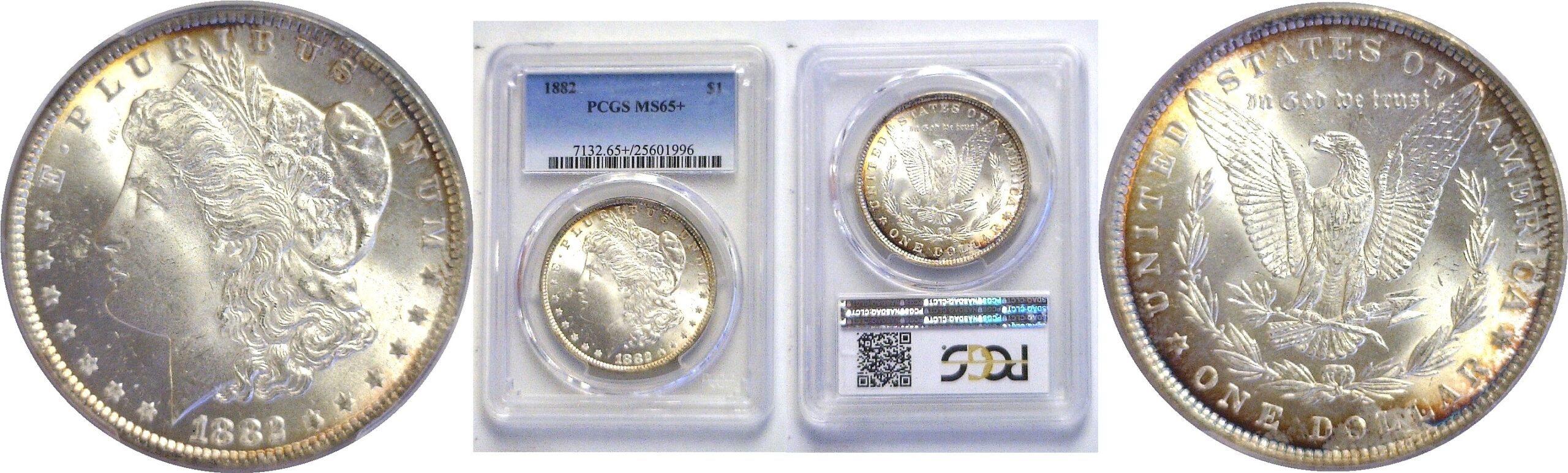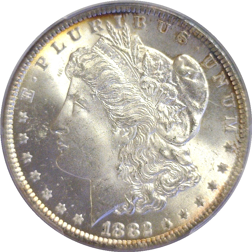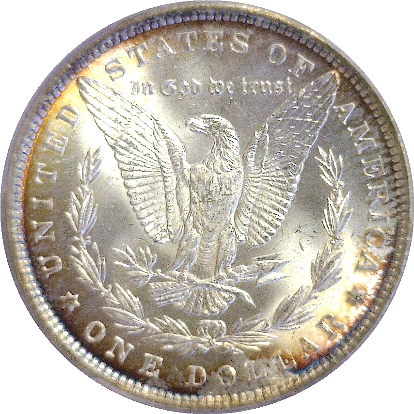 Very attractive and satiny white with gold and violet-blue toning along the periphery.