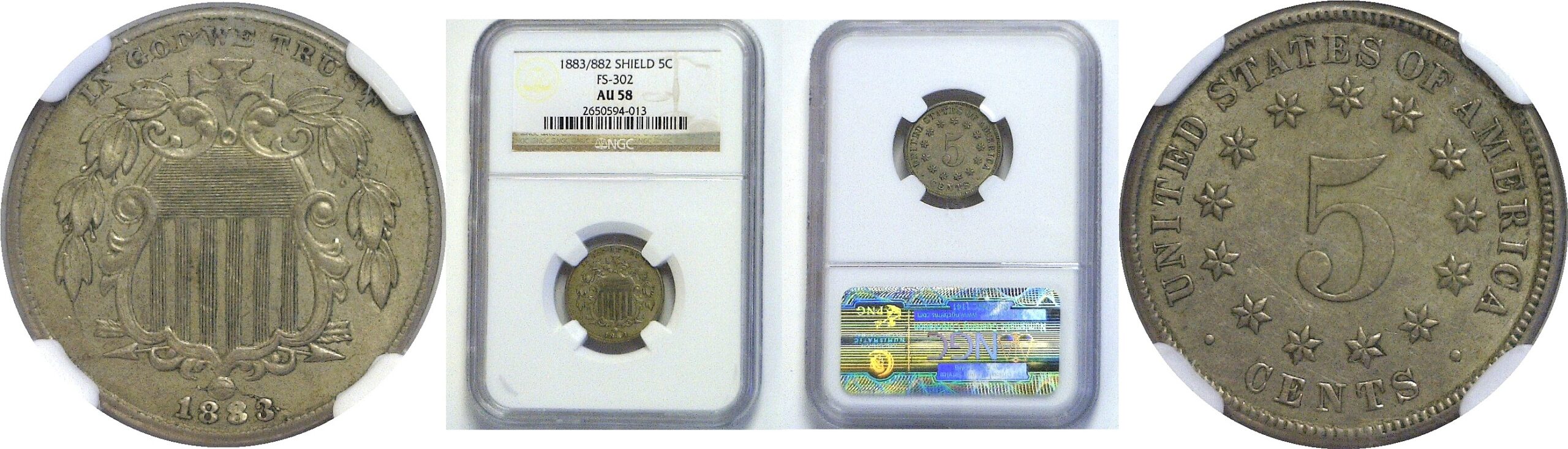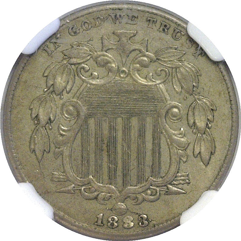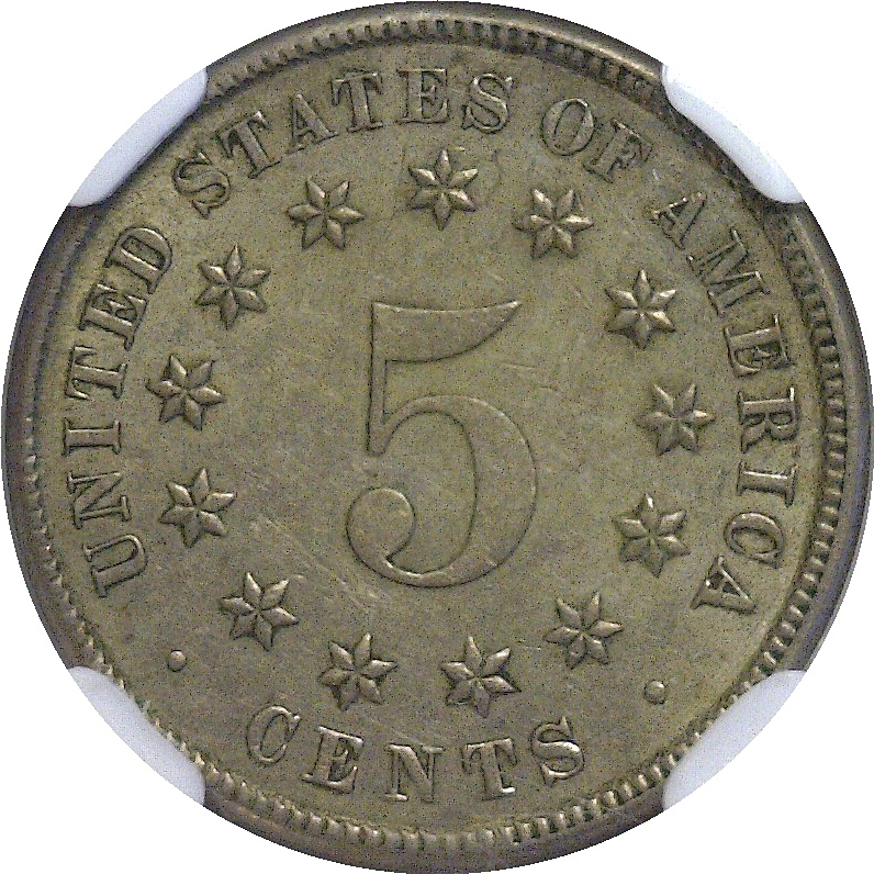 A well-detailed and nearly mint state example of this popular over-date. The 2 is clear and positioned left of the 3. An interesting obverse die-break runs from the rim, through the top of the 3, and into the bottom of the shield.