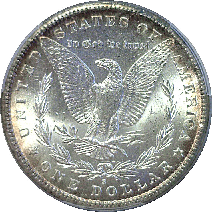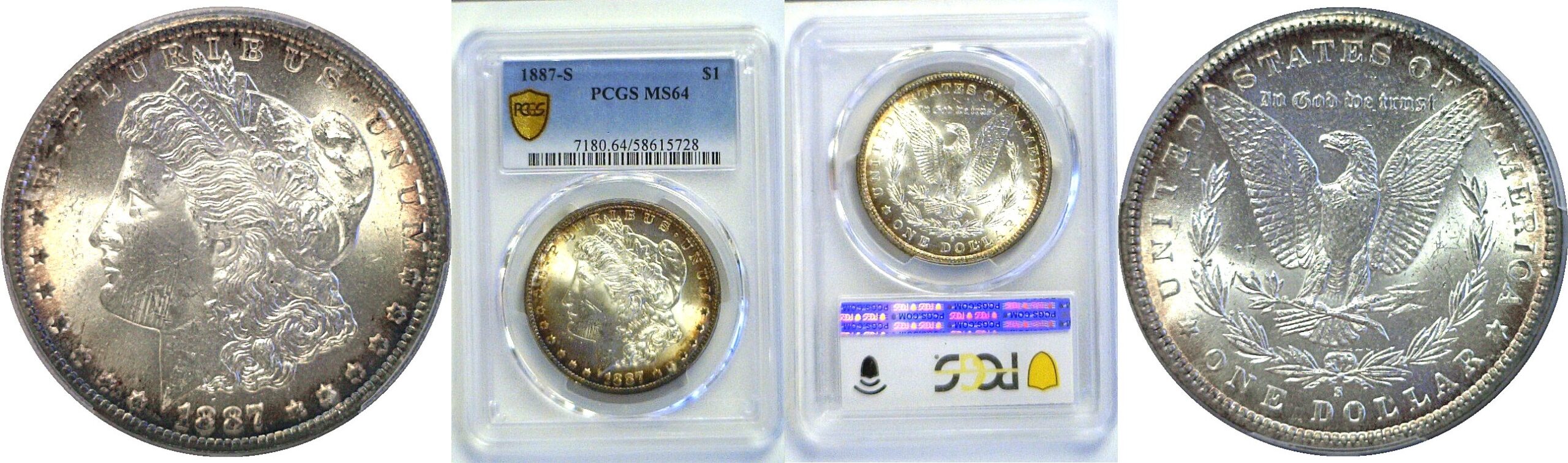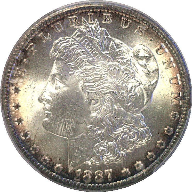 Sharply struck with an intense white lustrous core framed a thin peripheral ring of gold, russet, and deep blue toning.