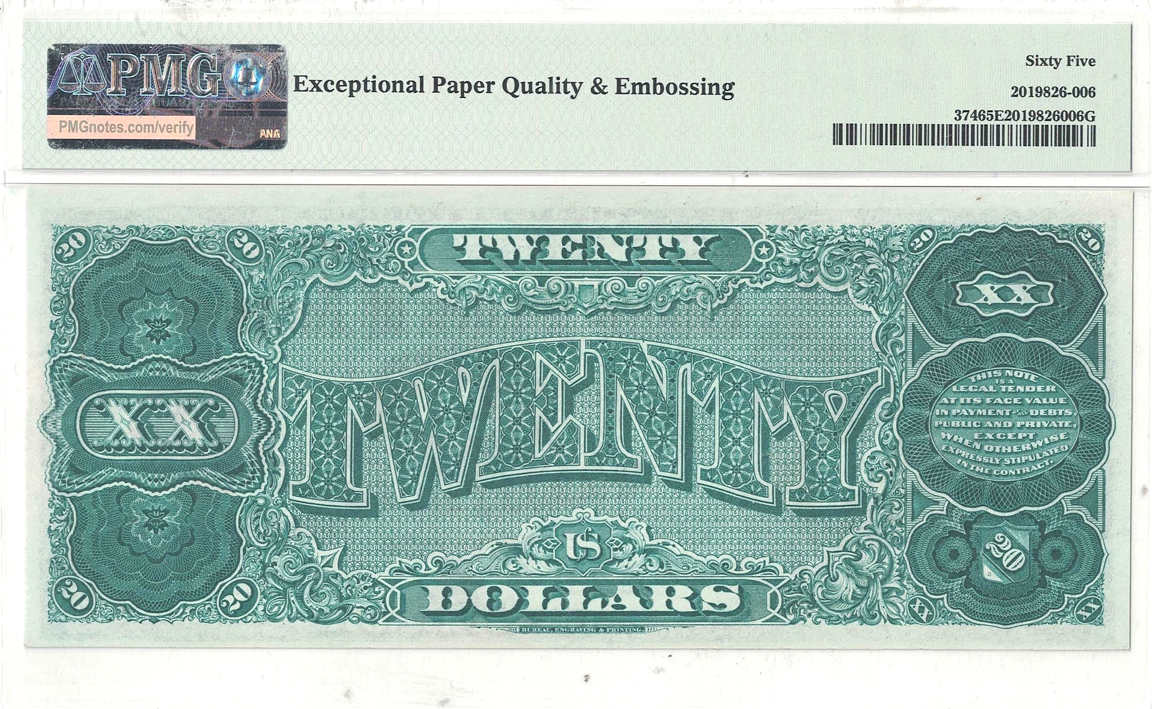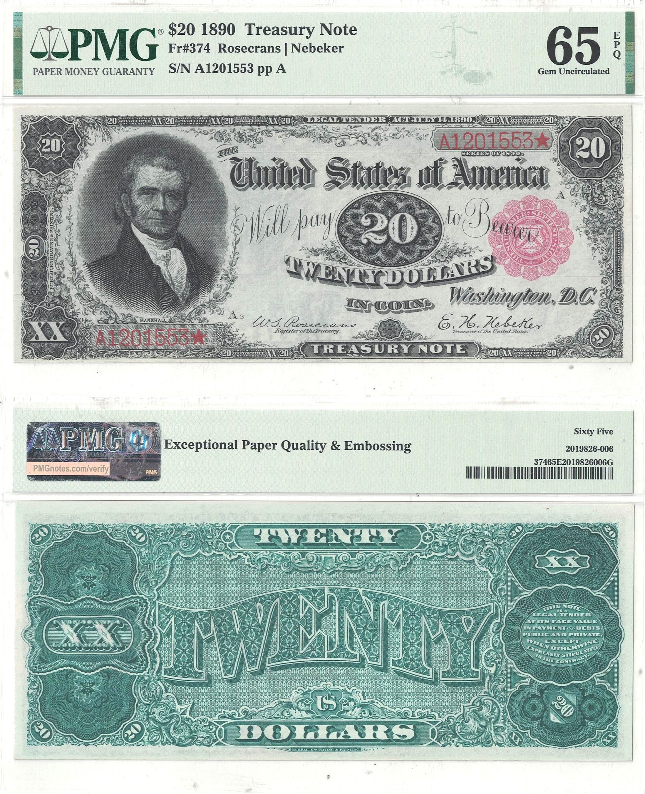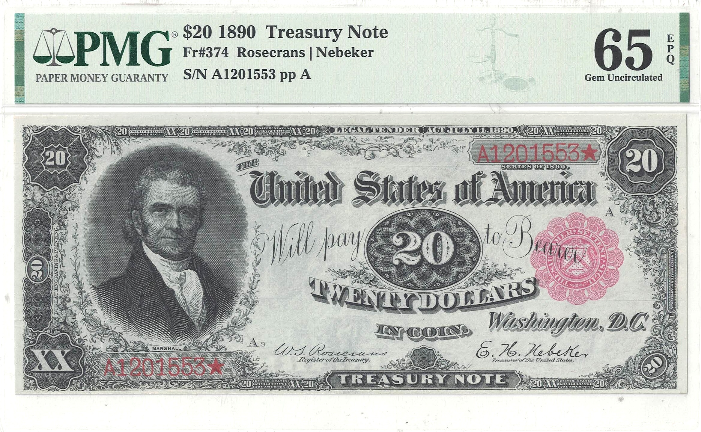 Portrait of John Marshall who served in the Supreme Court from 1801-1835 and became fourth Chief Justice of the United States. This stunning and gorgeous example displays rich black and red inks on the front and vibrant green ink on the reverse. The premium paper is as bright and fresh as the day of production. The nicely margined artwork displays intricate flourishes on the front and a grand ‘Twenty’ across the center of the back. Track & Price lists 130 known in all grades. PMG lists 62 total in PMG holders with 5 at this grade level and 3 finer.