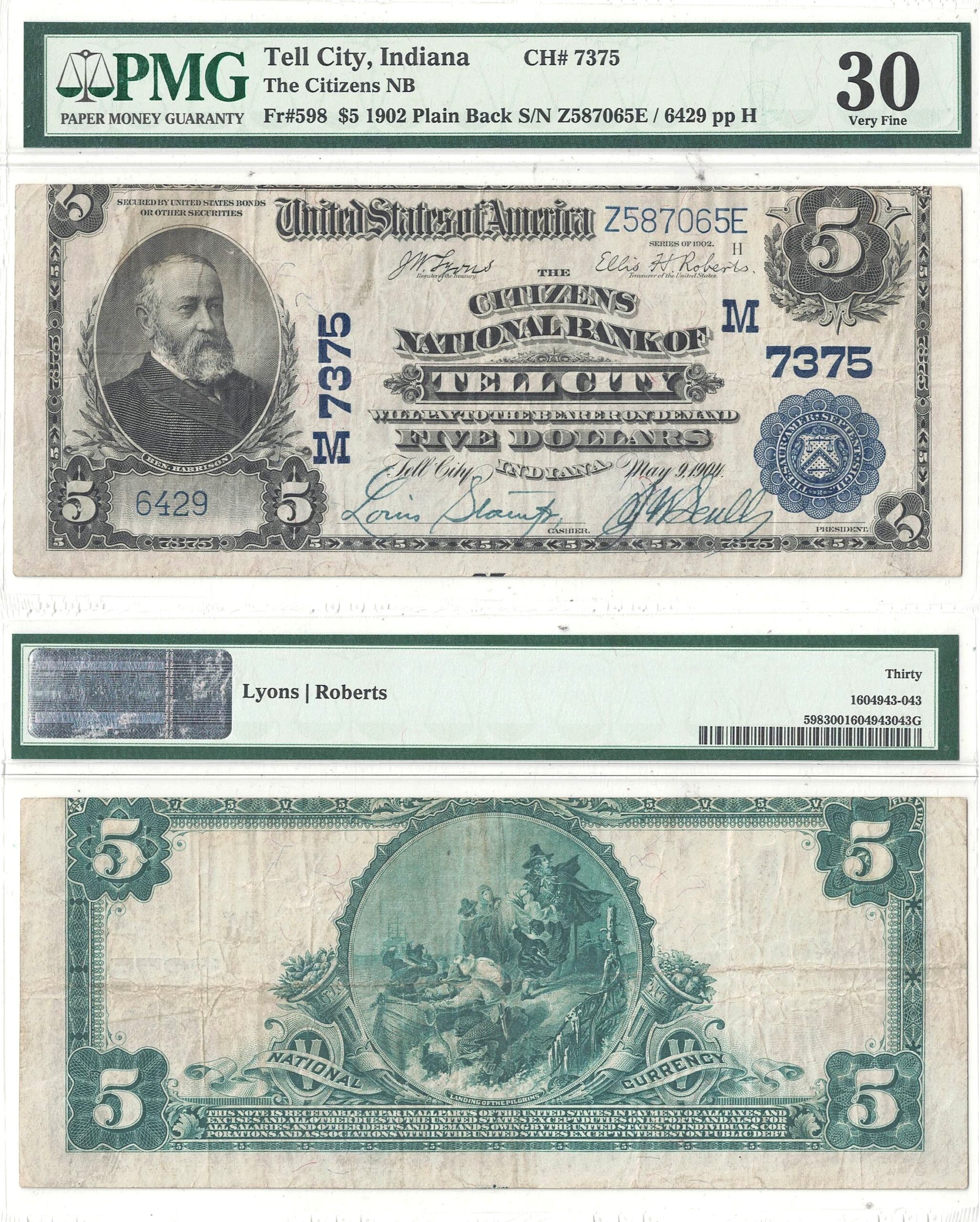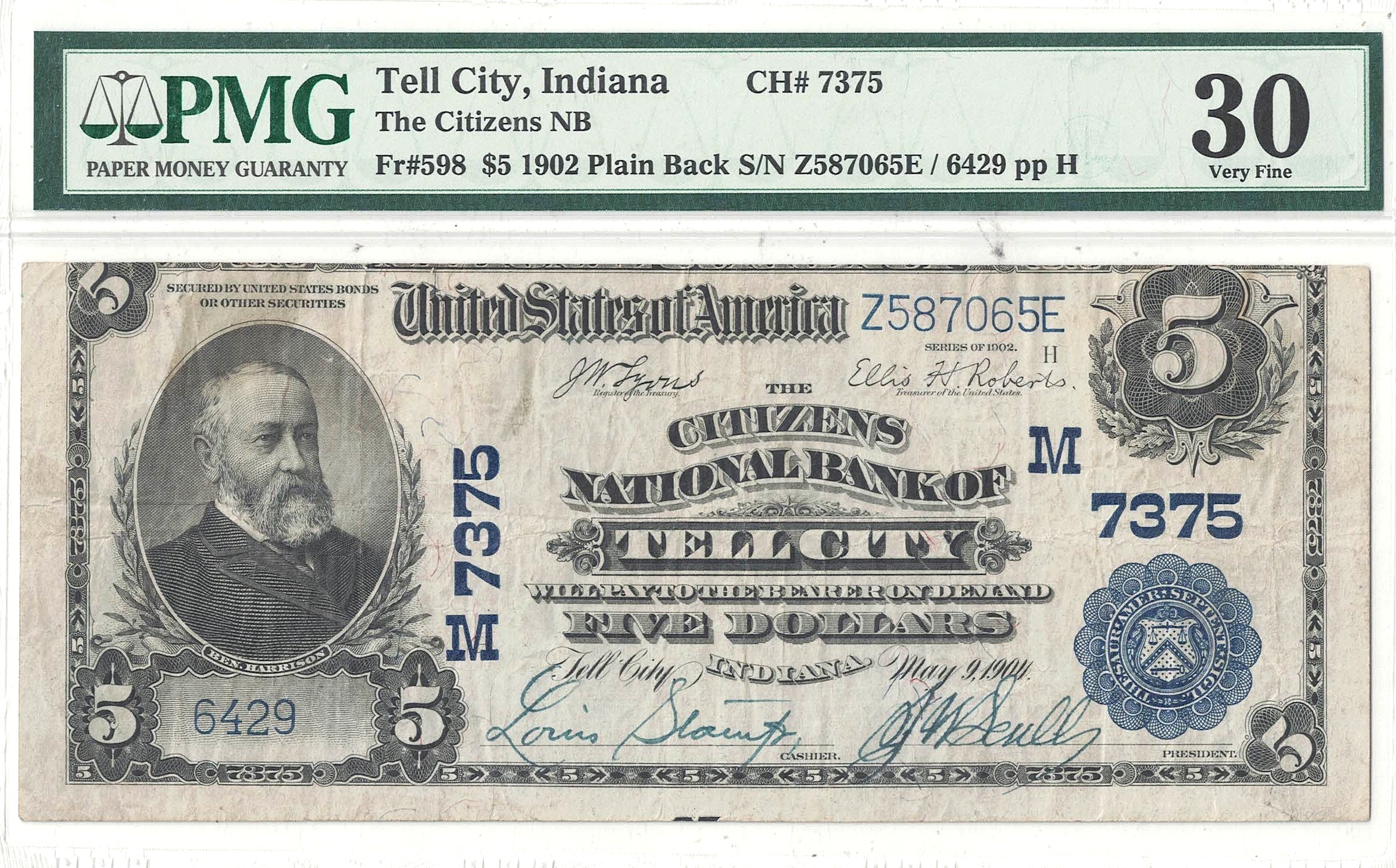 Citizens National Bank Of Tell City. Fr 598. Charter #7375. Plain Back. Vibrant inks and strong signatures stand out on a note with plenty of remaining brightness. Three margins are jumbo while the top margin is miscut into the design.