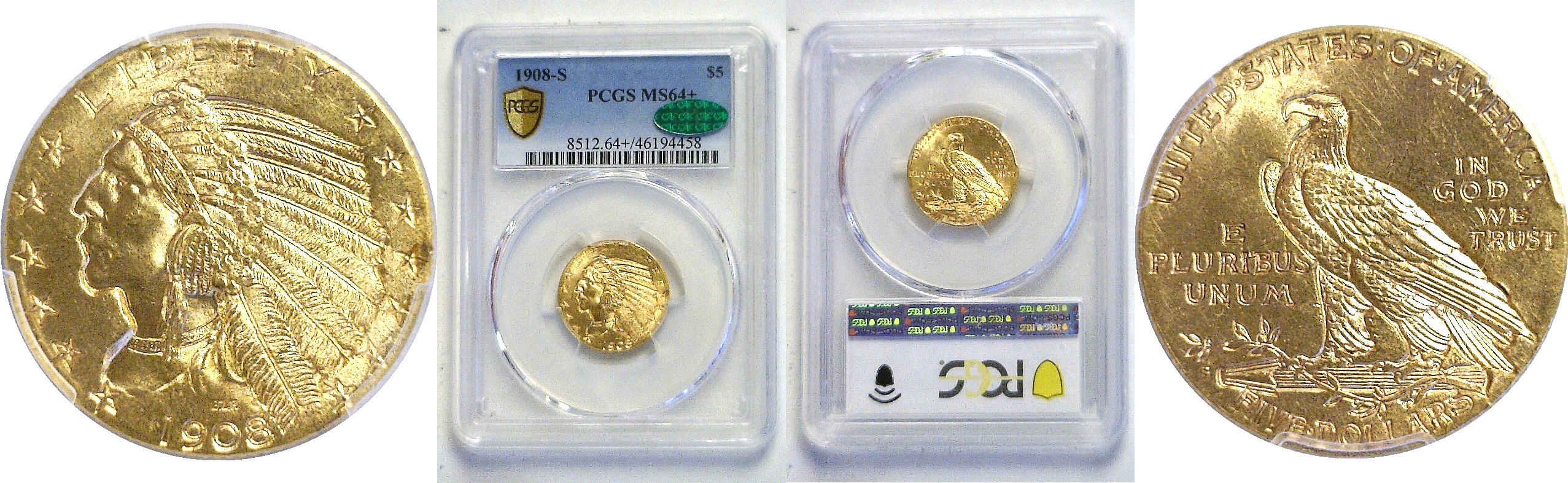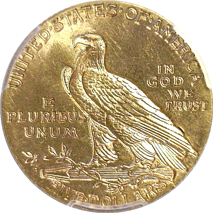 CAC. This is a better date with a relatively low mintage of 82,000 coins. However, a fair number of high grade coins have survived and they are among the prettiest coins in the entire series. This example has a few very minor tics that keep it out of a 65 or higher holder, but for pure eye appeal, it is amazing! The strike is needle-sharp and the luster intensity is as strong as you’ll find on any $5 Indian.