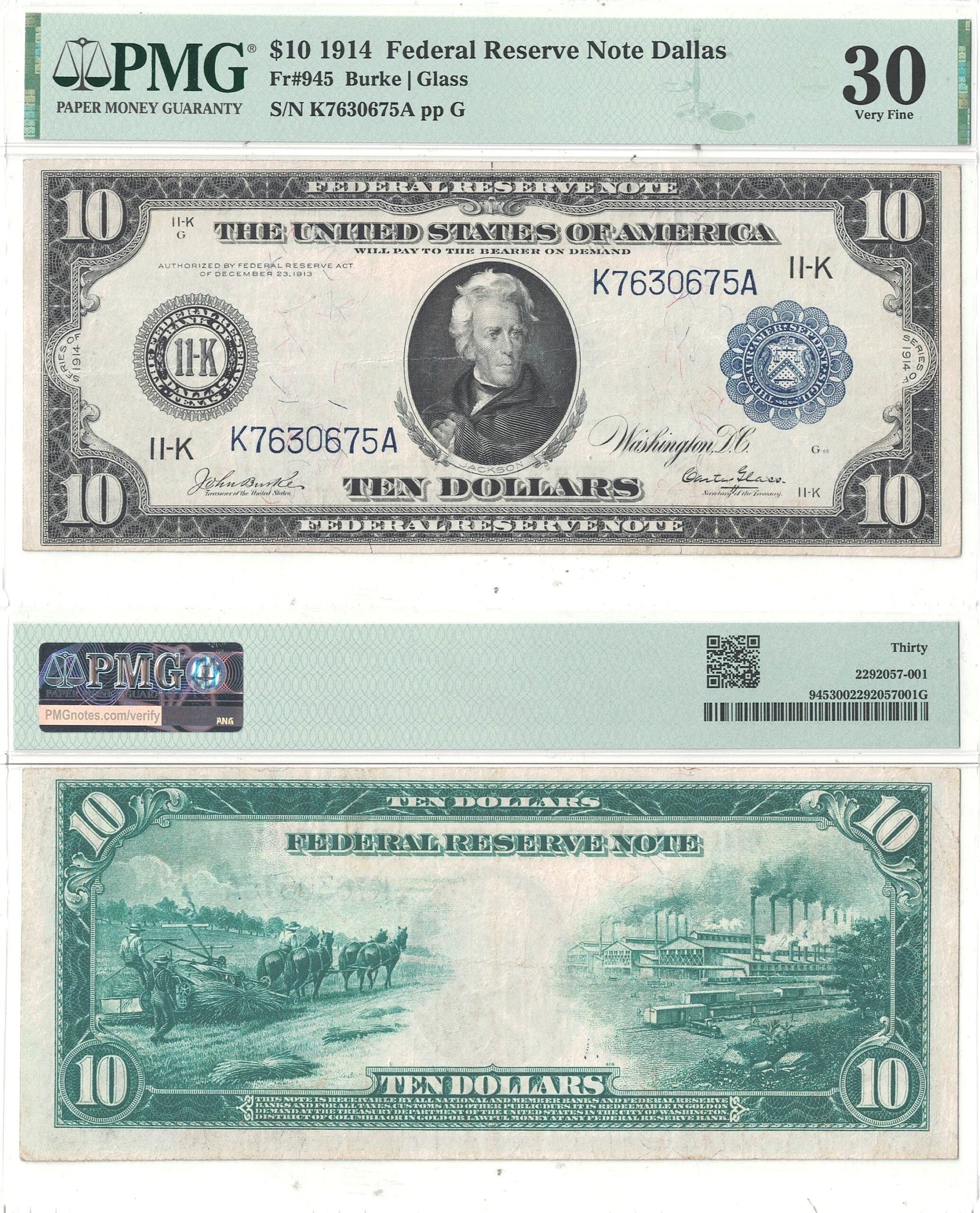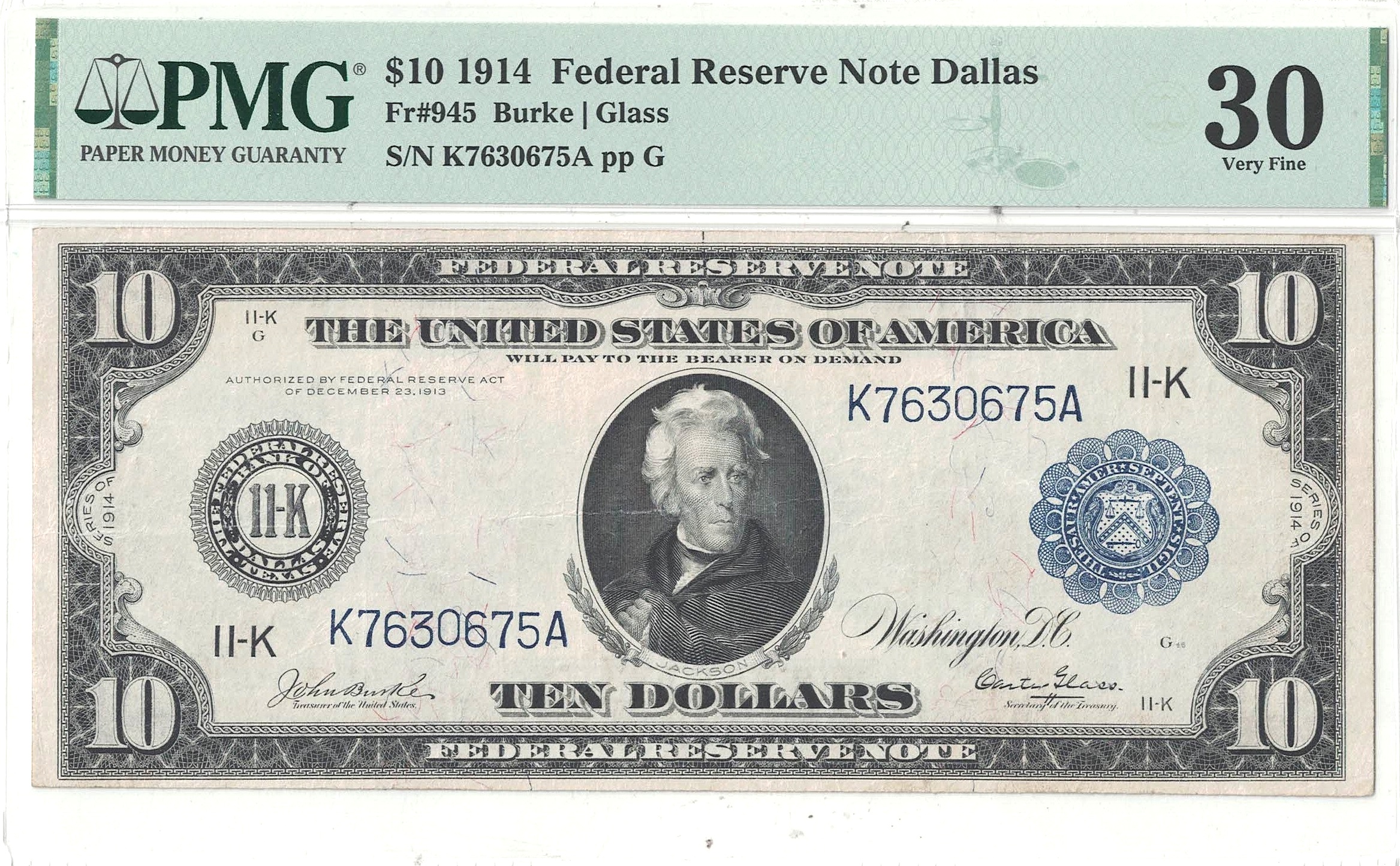 Dallas District. A scarce Burke/Glass note with only 40 known according to Track & Price. This example displays nice borders, strong inks, and plenty of remaining brightness.
