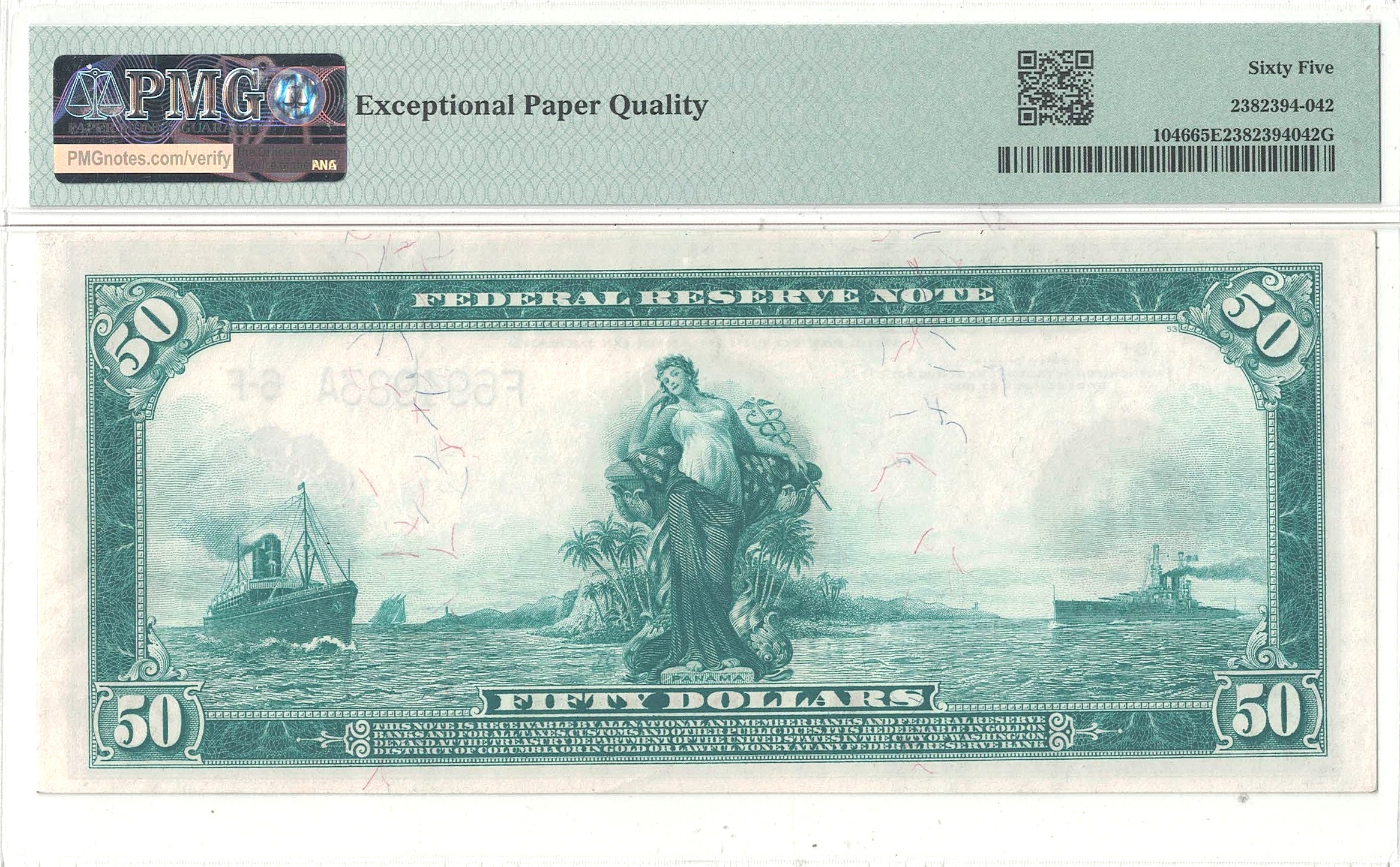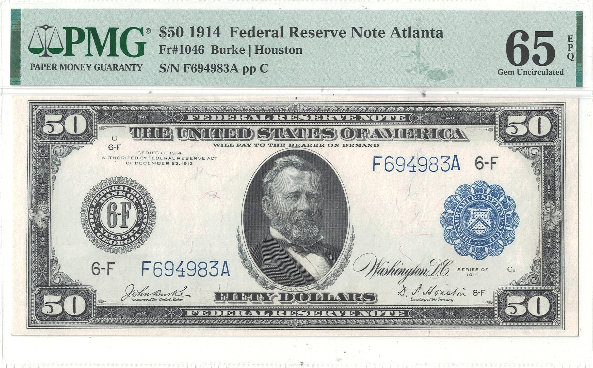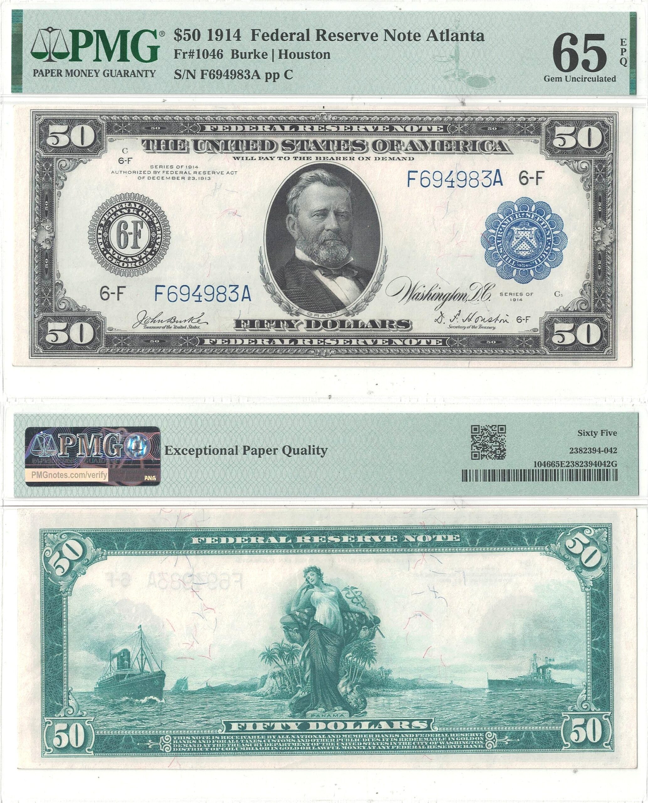 Atlanta District. Richly designed with a portrait of Ulysses Grant on the front and an allegorical woman representing the Panama Canal and Commerce on the back. A beautiful example with more than ample borders framing vivid inks and bright white premium paper. Only 9 notes grade finer at PMG.