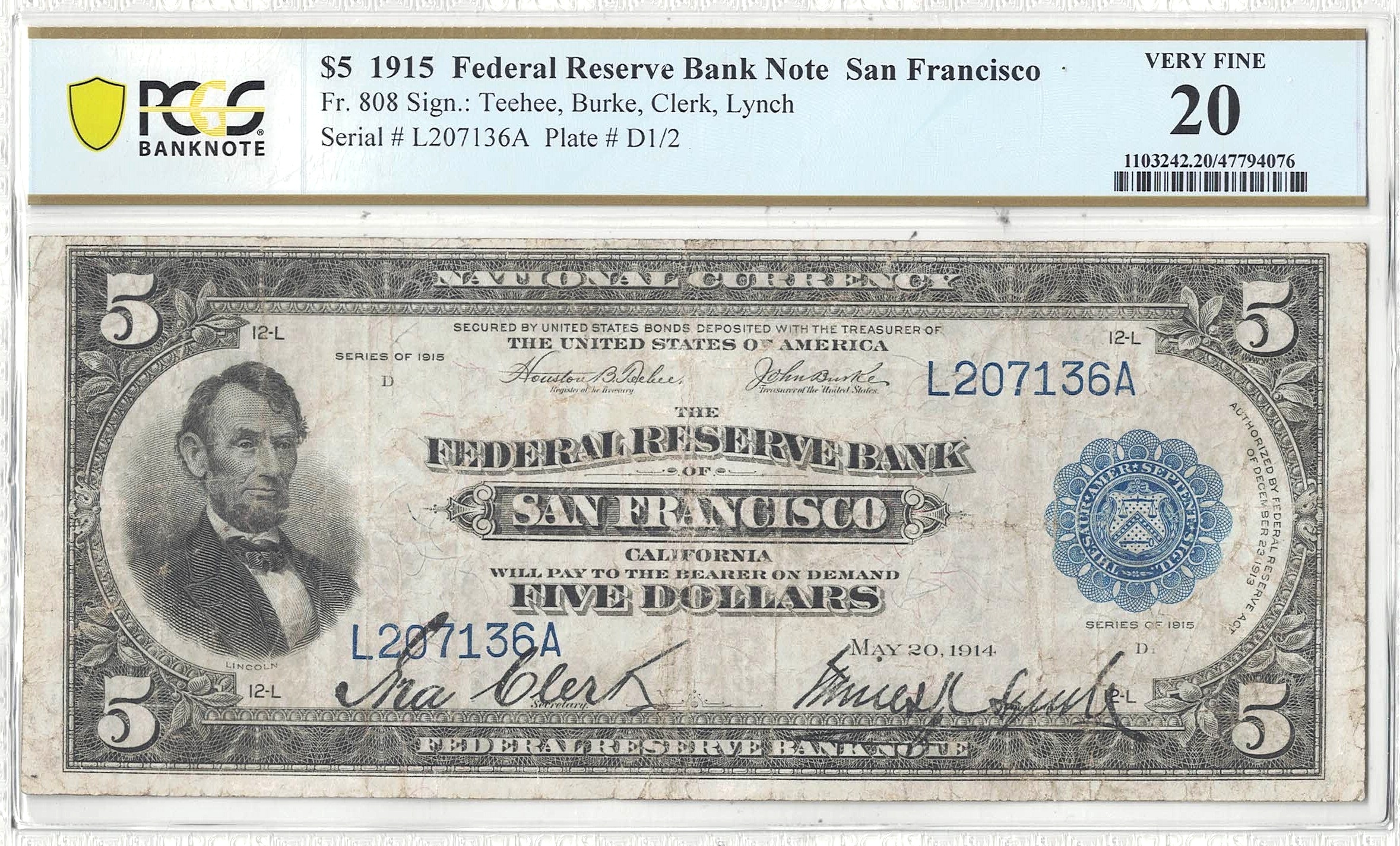 1915 $5 Federal Reserve Bank Note Fr-808 PCGS VF-20