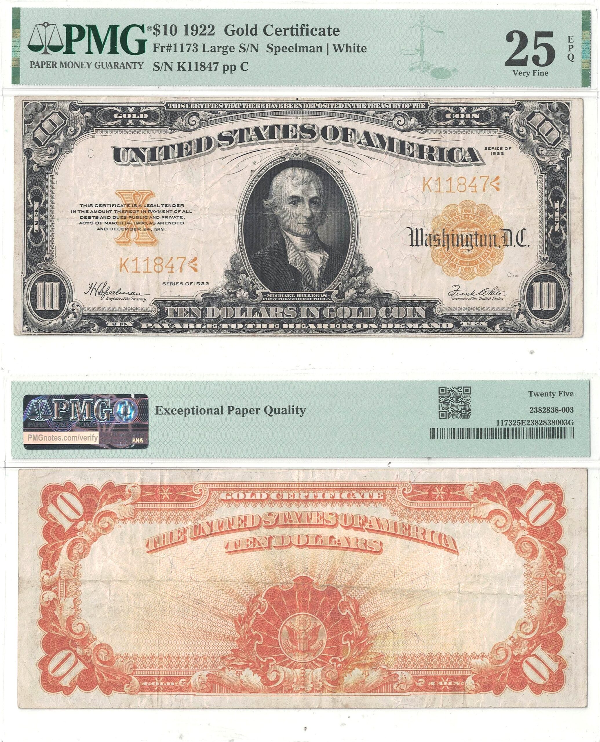 1922 $10 Gold Certificate Fr-1173 PMG VF-25 EPQ
