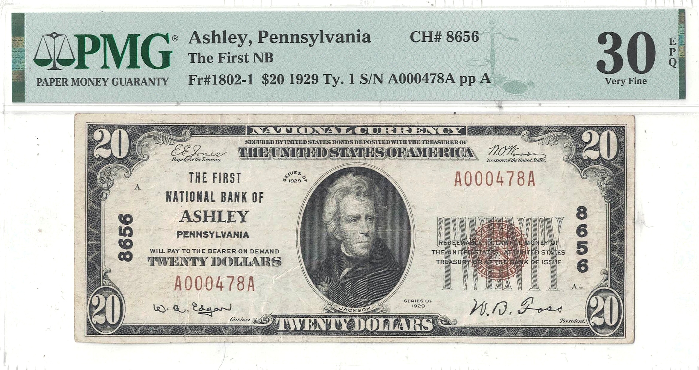 1929 $20 Pennsylvania, Ashley Charter 8656 PMG VF-30 EPQ