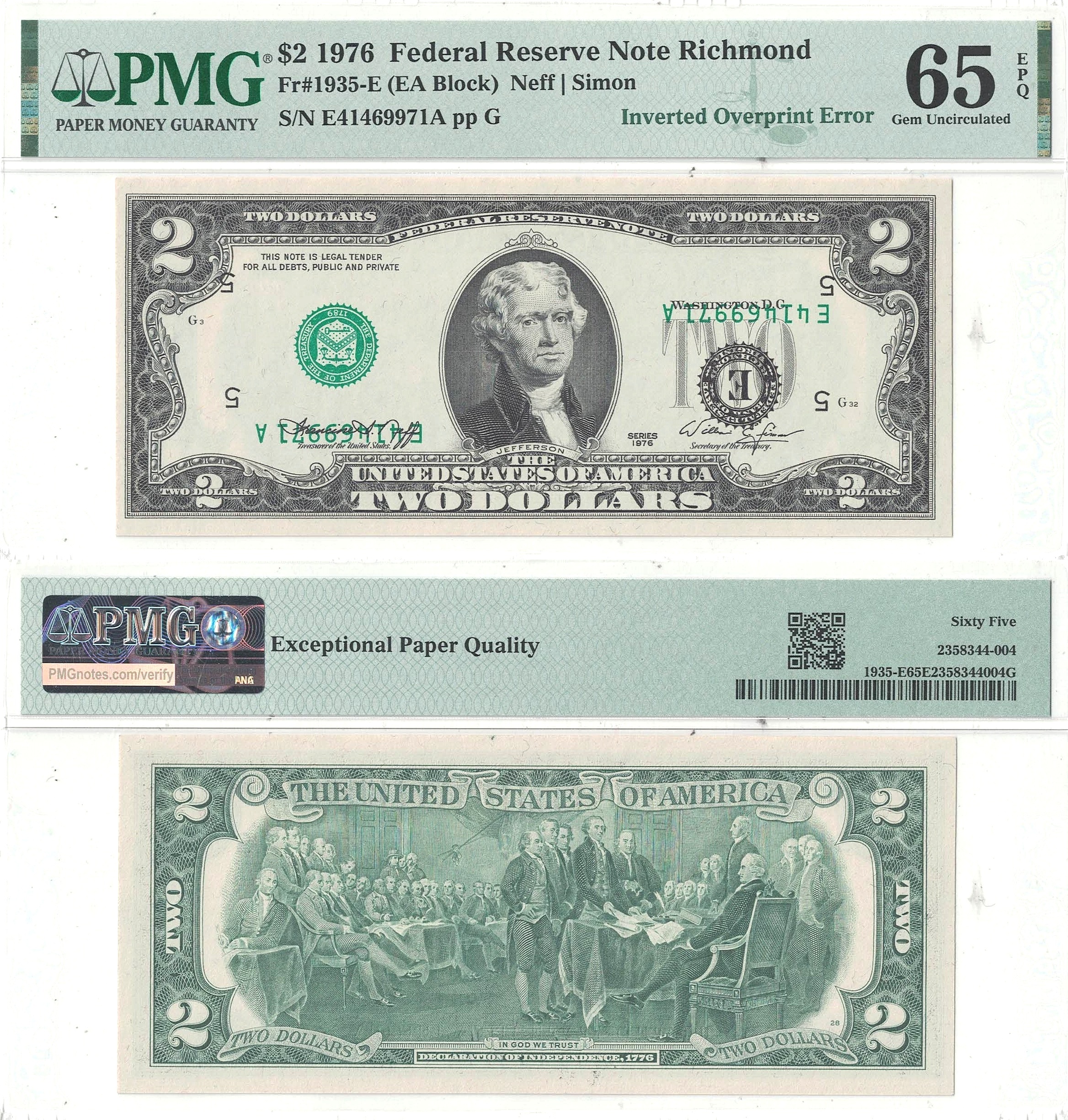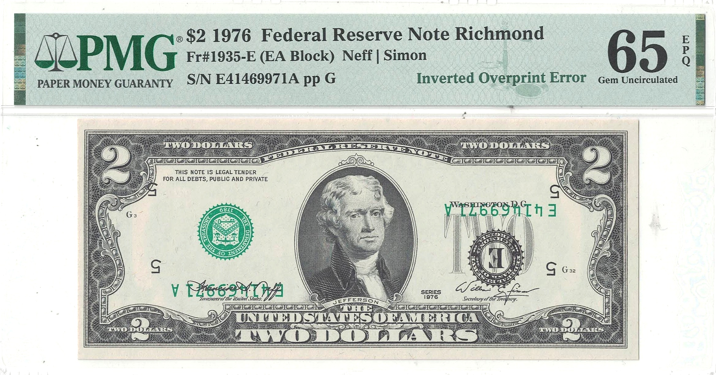 Inverted Overprint Error. Richmond District. A scarcer district Bicentennial deuce with a striking inverted 3rd print error. Margins are more than ample, and both the color and premium paper are bright and fresh. A tough denomination to acquire errors and this one really stands out.